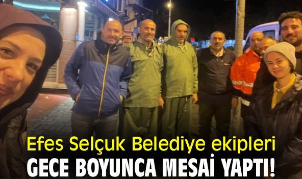 Dün akşam etkisini göstermeye başlayan olumsuz hava şartları Efes Selçuk'u da etkisi altına aldı. Şiddetli yağmurun olumsuz etkilediği özellikle mezarlık deresi ve Dutlu Yol bölgesinde Efes Selçuk Belediyesi Fen İşleri ekiplerinin hummalı çalışmaları sonucu herhangi bir olumsuzluk yaşanmadı. Gece yarısı başlayan ve sabaha kadar devam eden çalışmaları beraberindeki Başkan Yardımcıları Cansu Bakıcıol ve Mehmet Ihlamur ile birlikte bizzat yerinde takip eden Efes Selçuk Belediye Başkanı Filiz Ceritoğlu Sengel, bazı sorunları tespit edip İZSU yetkililerine de bildirdi.Başkan yardımcıları ile birlikte kentin dört bir yanını gezerek, her noktasını kontrol eden Başkan Sengel, sabaha kadar devam eden şiddetli yağmur altında çalışmaları titizlikle yürüten, ayrıca yine gün boyu devam eden yağmurda vatandaşların mağdur olmaları açısından temizlik ekiplerine de yardımcı olan Belediye Fen İşleri ekibine teşekkür etti. Başkan Sengel, sabaha karşı sosyal medya hesaplarından şu mesajı paylaştı: "Saat:05.45 Ekip tüm gece sabahlara kadar tam tekmil dışarda.Efes Selçuk Belediyesi emekçilerinin çalışmalarına İZSU ekipleri de destek verdi.