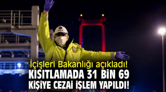 Bakanlık 25 Ocak Pazartesi gününden itibaren hafta içi 21.00 ila 05.00 saatleri arasında, hafta sonu 29 Ocak Cuma akşamı saat 21.00’de başlayıp 1 Şubat Pazartesi günü saat 05.00’e kadar süren sokağa çıkma kısıtlamalarına uymayan toplam 31 bin 69 kişiye adli ya da idari işlem yapıldığını açıkladı.İçişleri Bakanlığı'ndan yapılan açıklamada, Covid-19 salgını ile mücadelede toplumsal ve bireysel sağlığın korunmasına yönelik olarak uyguladığı sokağa çıkma kısıtlamasının devam ettiği belirtilerek,” Bu kapsamda; hafta içi 21.00 ila 05.00 saatleri arasında, hafta sonu ise Cuma akşamı saat 21.00'den Pazartesi günü saat 05.00'e kadar sokağa çıkma kısıtlanmıştır. Sokağa çıkma kısıtlamasına vatandaşlarımız büyük oranda uyum sağlamıştır. Kısıtlama kararına uymayan vatandaşlarımıza ise idari ya da adli işlem uygulanmıştır. 25 Ocak Pazartesi gününden itibaren hafta içi 21.00 ila 05.00 saatleri arasında, hafta sonu 29 Ocak Cuma akşamı saat 21.00'de başlayıp 1 Şubat Pazartesi günü saat 05.00'e kadar süren sokağa çıkma kısıtlamalarına uymayan toplam 31 bin 69 kişiye 1593 sayılı Umumi Hıfzıssıhha Kanunu ve TCK'nın ilgili maddeleri kapsamında adli ya da idari işlem yapılmıştır” ifadelerine yer verildi. Açıklamada, pandemi ile mücadele sona erip, normalleşme sürecine geçinceye kadar temizlik, maske ve mesafe olmak üzere diğer kurallara uyulmasının önemine vurgu yapıldı.