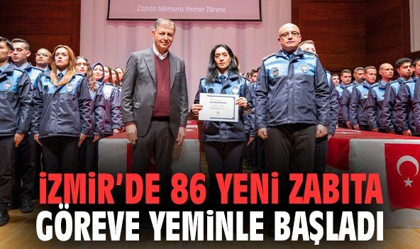 İzmir Büyükşehir Belediyesi, kente yönelik denetim ve kamu düzeni hizmetlerini daha etkin ve sağlıklı yürütmek amacıyla zabıta teşkilatını güçlendirmeye devam ediyor. Bu kapsamda zorlu eğitim süreçlerini tamamladıktan sonra zabıta teşkilatına katılan 86 yeni memur için Ahmed Adnan Saygun Sanat Merkezi’nde (AASSM) yemin töreni düzenlendi. İzmir Büyükşehir Belediye Başkanı Dr. Cemil Tugay’ın katılımıyla düzenlenen törende ayrıca İzmir Büyükşehir Belediye Başkan Vekili Dr. Zafer Levent Yıldır, İzmir Büyükşehir Belediyesi Genel Sekreteri Zeki Yıldırım ile bürokratlar ve zabıta personeli yer aldı.