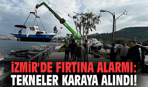 Meteoroloji İzmir Bölge Müdürlüğü bugün için fırtına uyarısında bulundu. Balıkçı tekneleri, muhtemel şiddetli fırtınaya karşı güvenlik önlemi olarak vinçler yardımıyla karaya alındı.