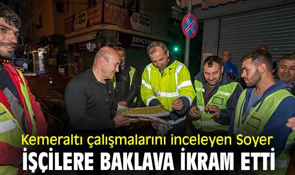 Altyapı ve üstyapı çalışmalarının beraber ilerlediği Kemeraltı'nda atık su, yağmur suyu ve içme suyu hatları ile aydınlatma, gerilim hatları yenileniyor, yollar beton ile kaplanıyor ve granit döşeniyor. Deprem bölgesindeki inceleme programının ardından kente gelen İzmir Büyükşehir Belediye Başkanı Tunç Soyer, tarihi çarşıda akşam saatlerinde yürütülen çalışmaları inceledi ve personele baklava ikram etti.