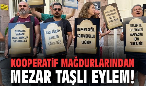 İzmir Büyükşehir Belediyesi'nin iştiraki İZBETON denetiminde kooperatifler eliyle başlatılan kentsel dönüşüm projelerinde mağdur olan kooperatif üyeleri, İzmir Büyükşehir Belediyesi Egemenlik Binası önünde basın açıklaması yaptı. Mağdurlar, açıklamadan sonra mezar taşı şeklinde tasarlanan dövizlerini bina önüne bıraktı. Açıklamasında depremde yaşanacak can kayıplarından da bizzat Cemil Tugay sorumlu olacağını söyleyen mağdurlar, kooperatif mağduriyetinden dolayı tutuklananları cezaevinde ziyaret eden ve dayanışma çağrılarında bulunan CHP'li siyasileri de hedef aldı.