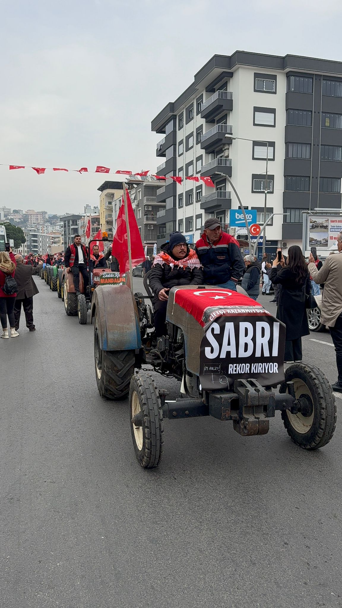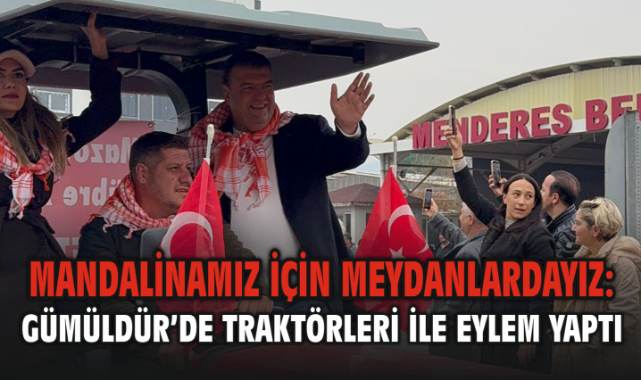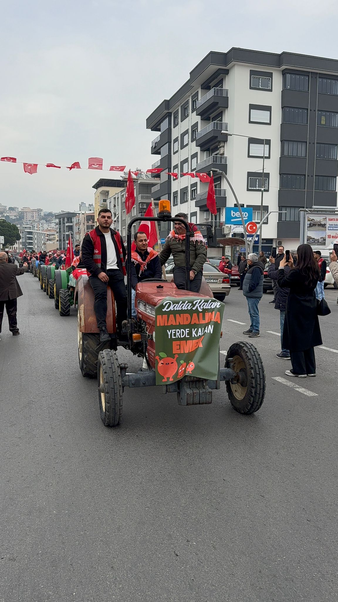 “Mandalinamız için meydanlara iniyoruz” çağrısıyla düzenlenen etkinlikte çiftçiler traktörleriyle Gümüldür Pazaryeri’nde bir araya geldi.