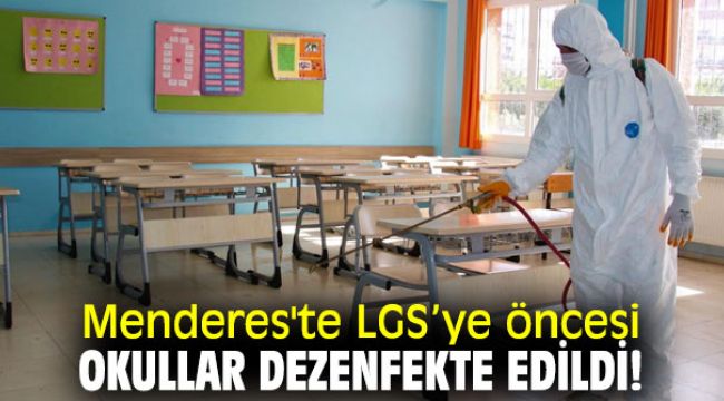 Menderes Belediyesi Temizlik İşleri Müdürlüğü tarafından ilçe genelinde koronavirüse karşı dezenfekte çalışmaları tüm hızıyla devam ediyor. 20 Haziran Cumartesi günü gerçekleşecek Liselere Geçiş Sınavı (LGS) için ilçedeki okullarda da dezenfekte çalışmaları yapıldı.