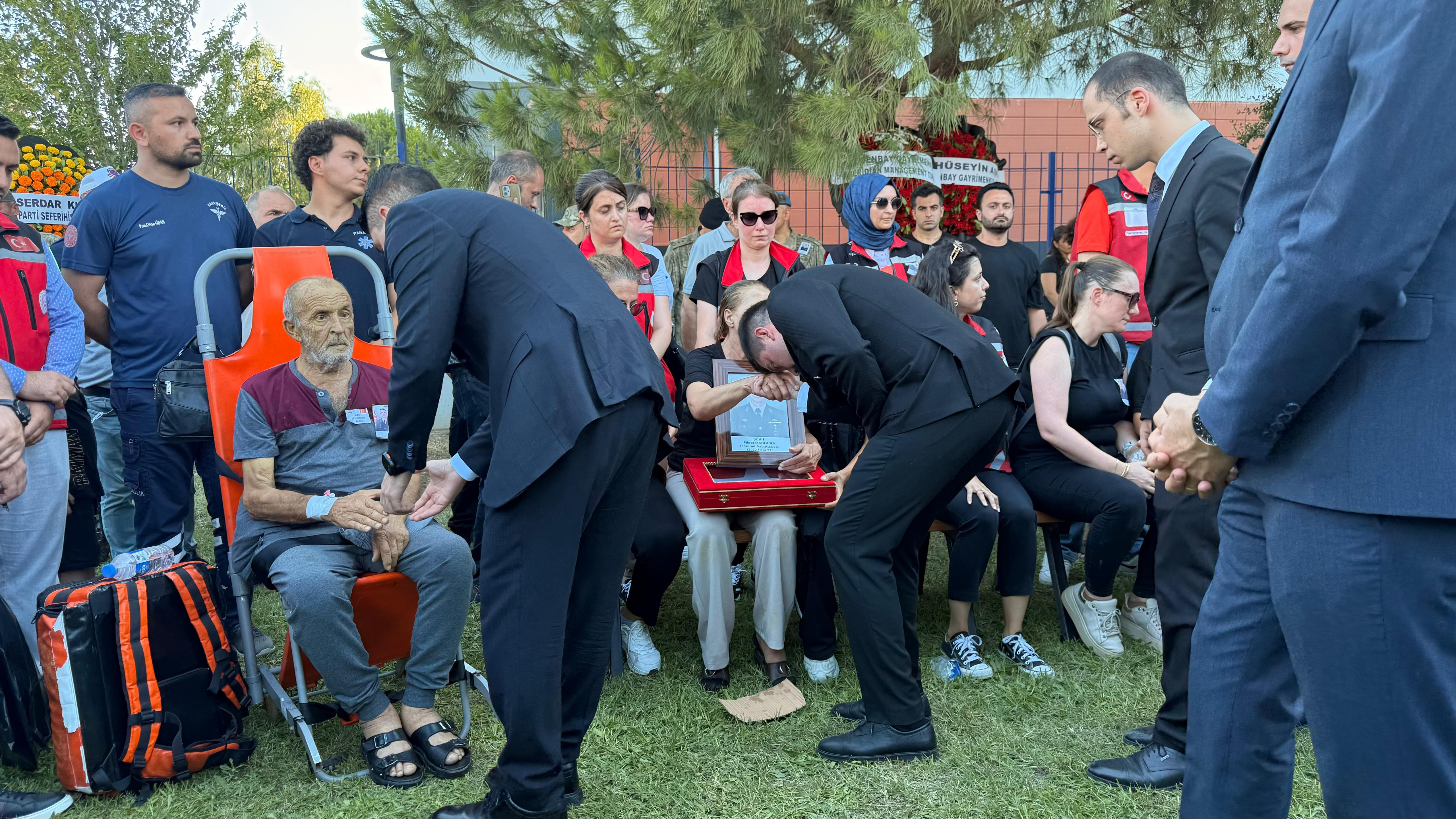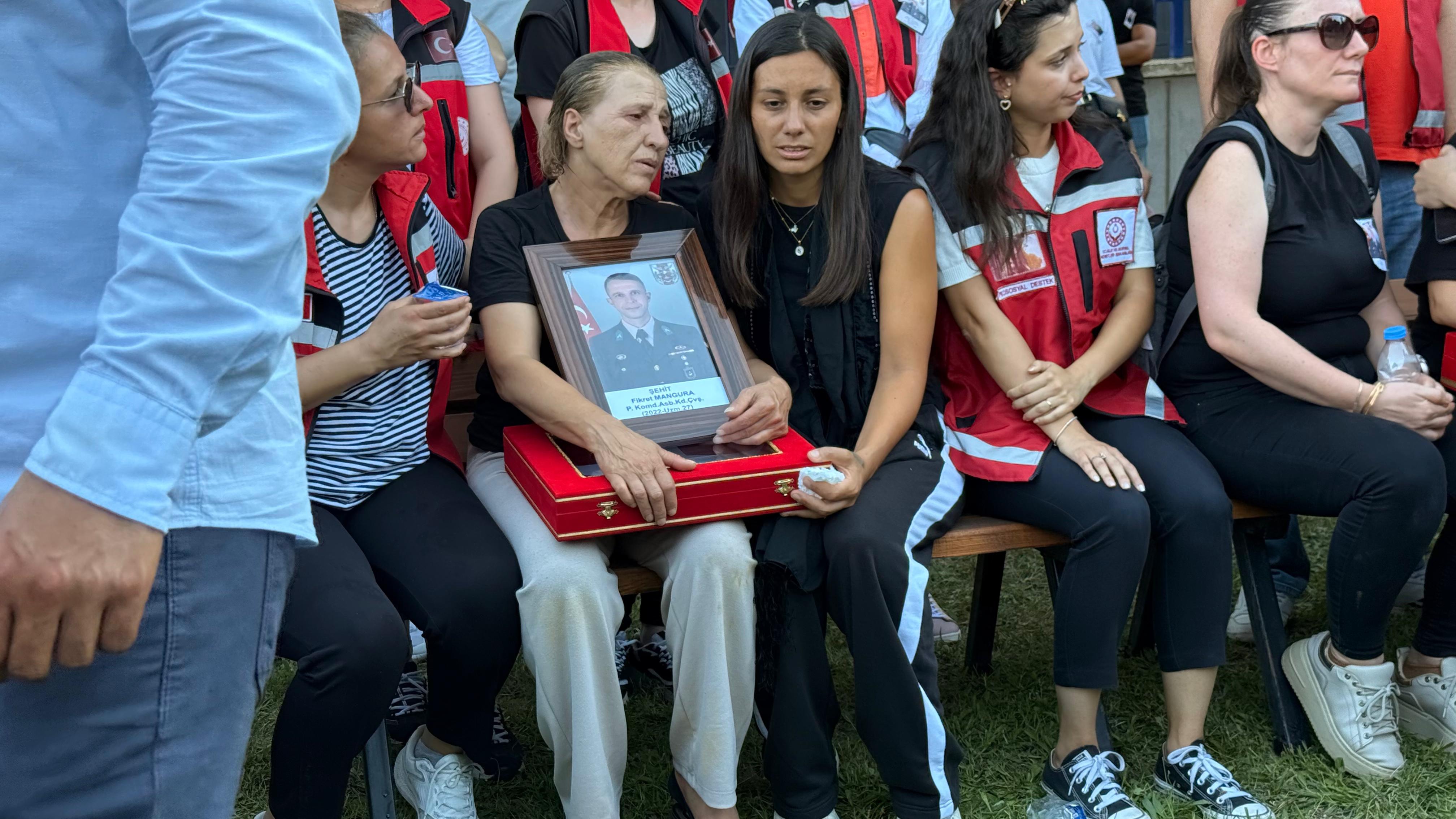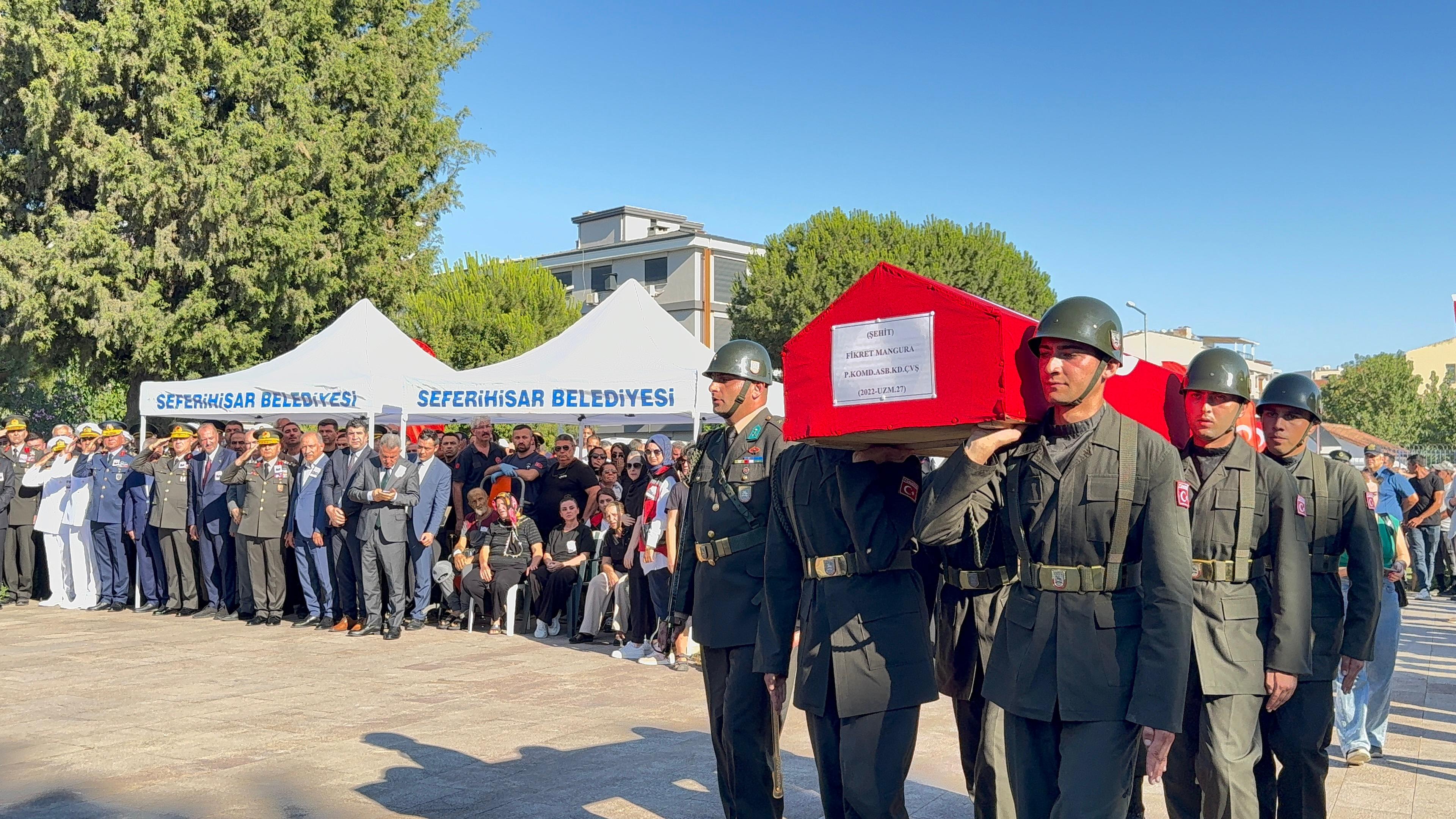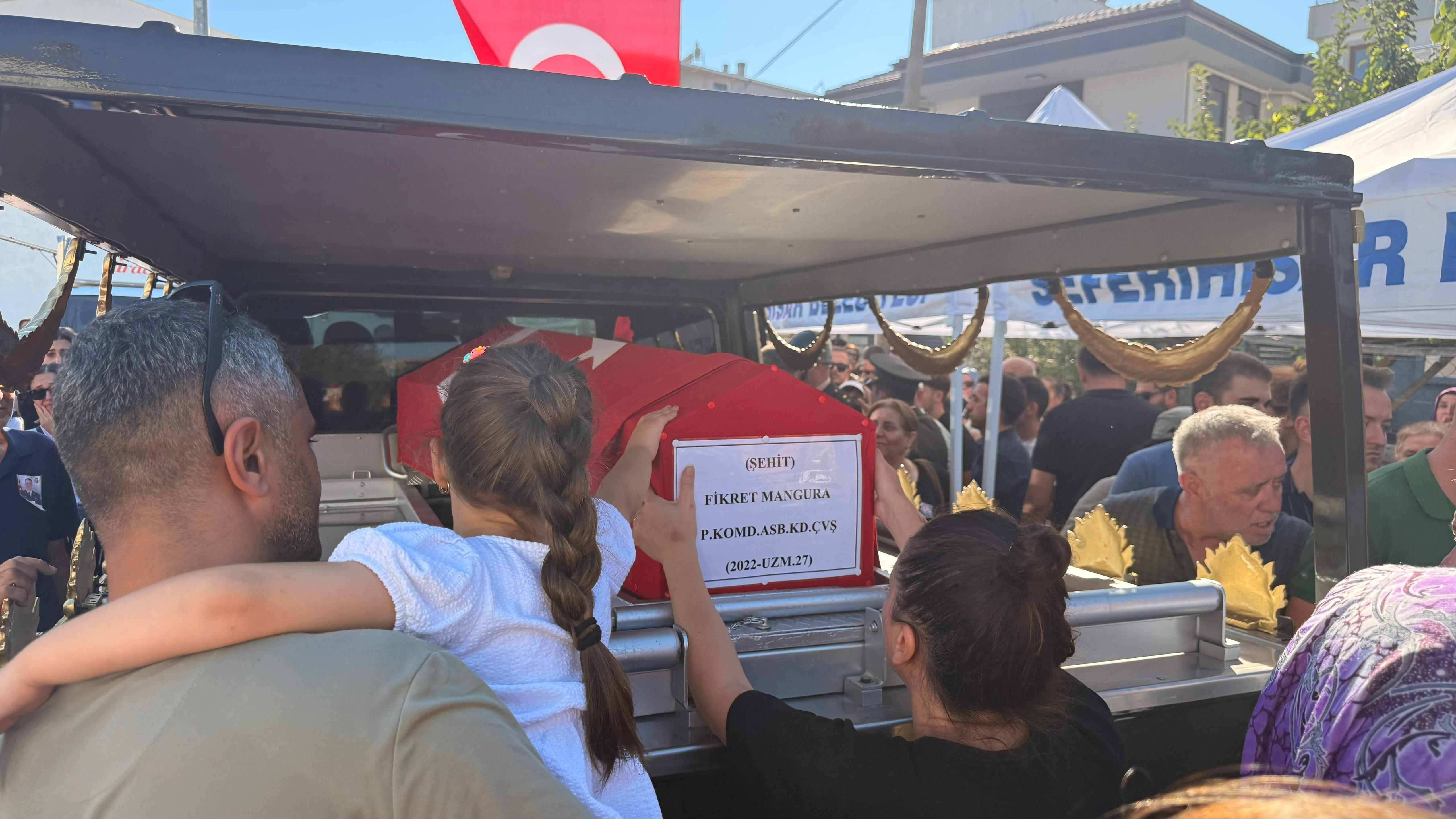 KIZI DENİZ ECE, TÖRENDE BABASINA AİT BEREYİ TAKTIMangura’nın pankreas kanseri nedeniyle Manisa Celal Bayar Üniversitesi Hafsa Sultan Hastanesi'nde tedavisi süren babası Vasfi Mangura (65) törene sağlık ekipleri eşliğinde katlanabilir sedye ile getirildi. Şehidin kızı Deniz Ece, törene babasına ait askeri bereyle katıldı. Şehidin annesi Misliye Ozan (67), eşi Melahat Mangura, kardeşi Nihat Mangura ve kızı Deniz Ece, Türk bayrağı sarılı tabuta sarılıp, gözyaşı dökerek Fikret Mangura’nın fotoğrafını öptü.Şehidin kardeşi Nihat Mangura ise ağabeyi Mangura'nın tabutu başında bekleyen askerlerin terleyen yüzünü peçeteyle sildi.Şehidin Türk bayrağına sarılı tabutu askerlerin omzunda cenaze aracına taşındı. Mangura'nın cenazesi, toprağa verilmek üzere eferihisar ilçesindeki Seferihisar Şehitliği'ne götürüldü.Şehit Mangura, gözyaşları ve dualar eşliğinde toprağa verildi. Törende birlik ve beraberlik mesajları verilirken, katılımcılar şehidin ailesine başsağlığı dileklerinde bulundu.